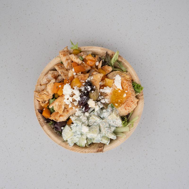Arcadian greens, Mediterranean grilled chicken, grilled peppers and onions, homemade hummus, fresh cucumber salad, & kalamata olives.